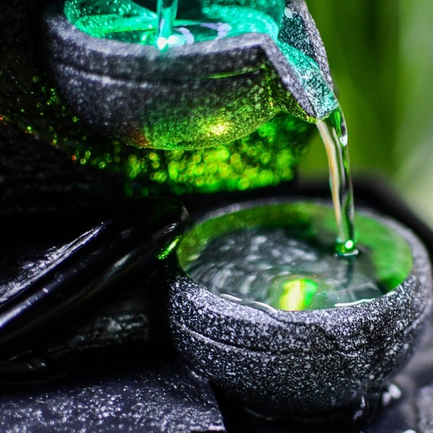 De stille pomp zorgt ervoor dat het water in een gesloten circuit blijft stromen, terwijl de kleur veranderende LED-verlichting het reliëf van het decor en de beweging van het water benadrukt.